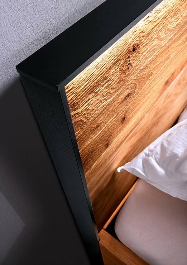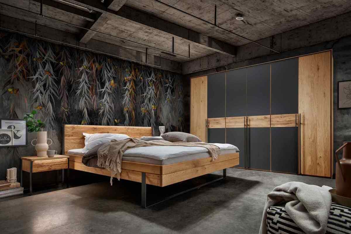 Das Modell Boston wird aus massiver Wildeiche gefertigt und besticht durch seine schwebende Leichtigkeit und die natürliche Struktur des Holzes. Die geschroppte Oberfläche des Kopfteils und die matten dunklen Elemente verleihen dem Bett eine außergewöhnliche Ausstrahlung, die durch die geölte Oberfläche des Vollholzes noch unterstrichen wird.