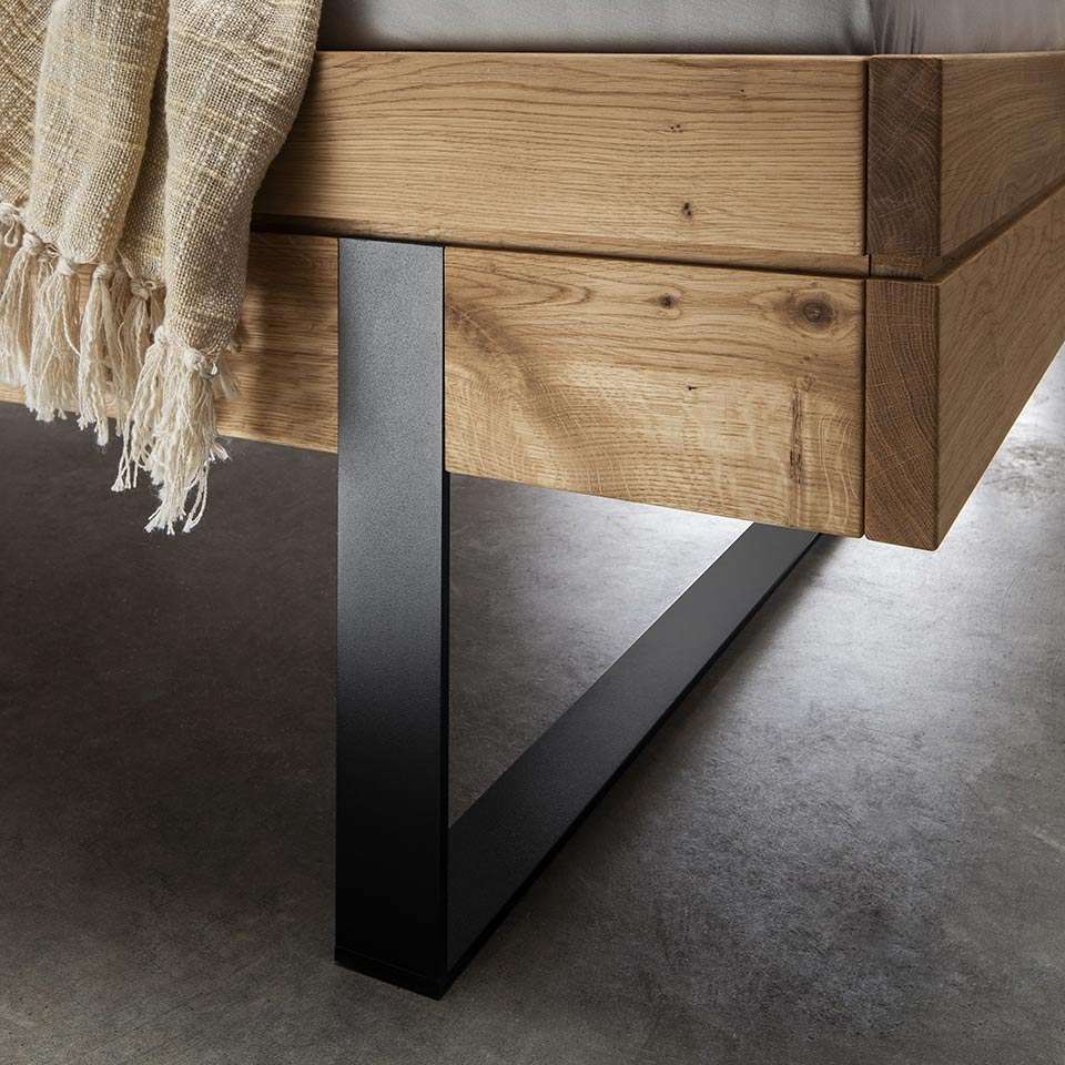 Das Modell Boston wird aus massiver Wildeiche gefertigt und besticht durch seine schwebende Leichtigkeit und die natürliche Struktur des Holzes. Die geschroppte Oberfläche des Kopfteils und die matten dunklen Elemente verleihen dem Bett eine außergewöhnliche Ausstrahlung, die durch die geölte Oberfläche des Vollholzes noch unterstrichen wird.